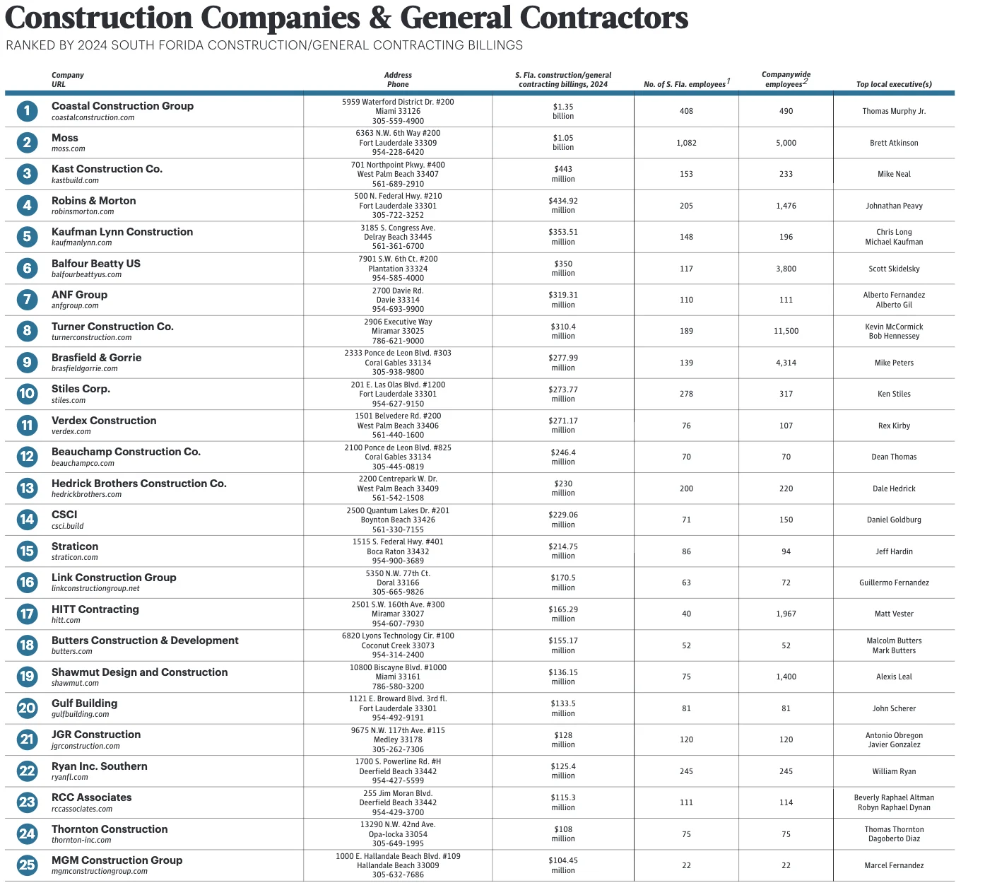 Ranked by S. Fla. Construction/general contracting, billings, 2024
